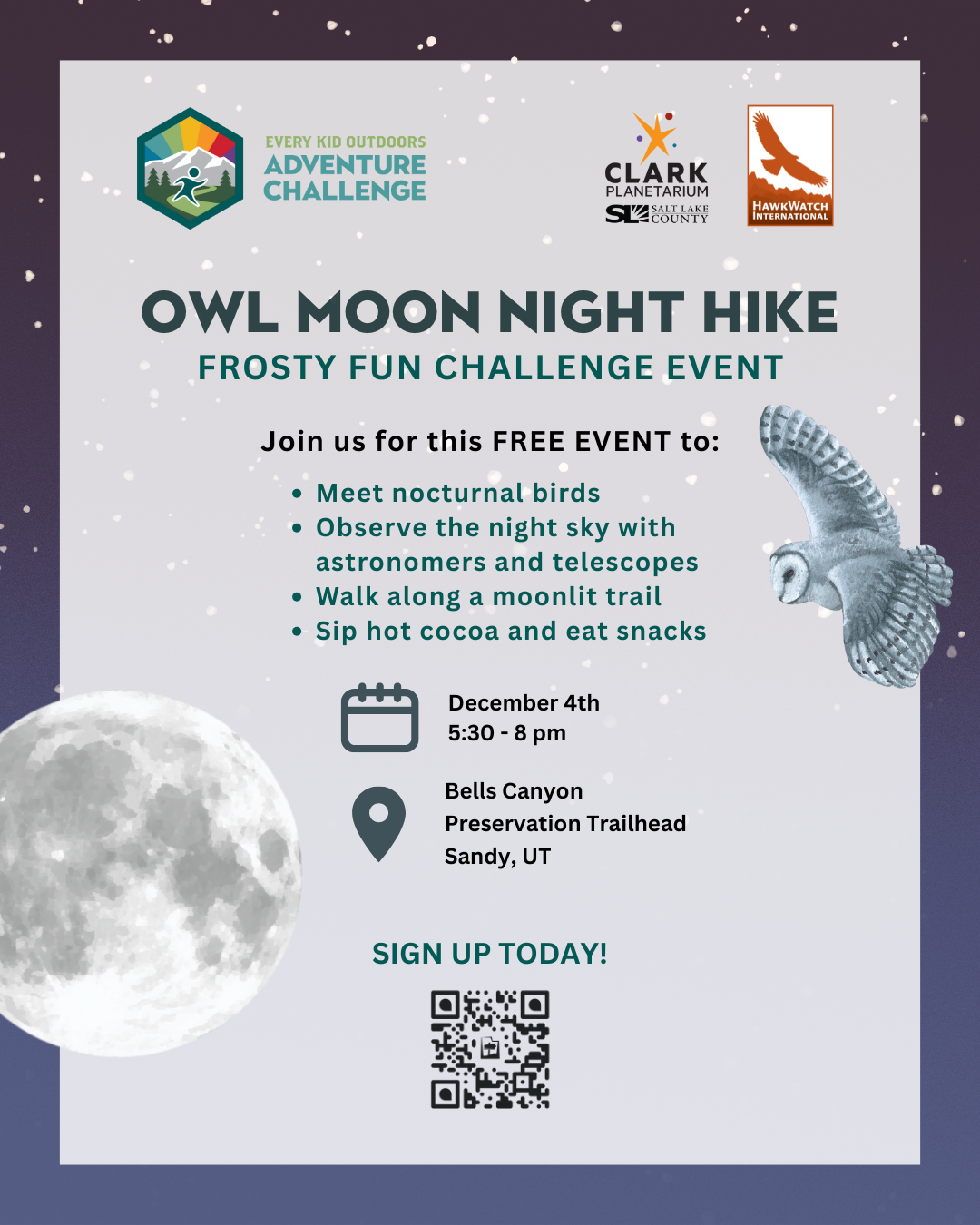 Discover the magic of winter nights under a full moon on a night hike at Bell Canyon Preservation Trailhead! Perfect for families, this in-person event offers a unique outdoor adventure under the stars. We’ll have Hawkwatch International showcasing nocturnal birds and Clark Planetarium guiding us through the night sky with telescopes. Starting at 7 PM, join us on a night hike. Grab your flashlight, bundle up, and experience Utah’s winter beauty!